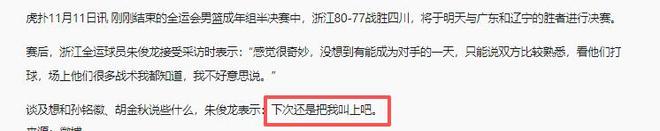 赛后浙江队员非常兴奋和自豪,代表浙江队比赛的朱俊龙嘲讽和调侃了昔日俱乐部队友,实际就是嘲讽和调侃四川队。朱俊龙接受采访时表示:“感觉很奇妙,没想到有能成为对手的一天,只能说双方比较熟悉,看他们打球,场上他们很多战术我都知道,我不好意思说。”谈及想和孙铭徽、胡金秋说些什么,朱俊龙表示:下次还是把我叫上吧。这明显是一种调侃和嘲讽,也就是说四川下次想赢球,还得把我朱俊龙买到四川队。这嘲讽,让代表四川队比赛的王博、孙铭徽、胡金秋、赵嘉仁、赵岩昊们感到真的是不好意思了。